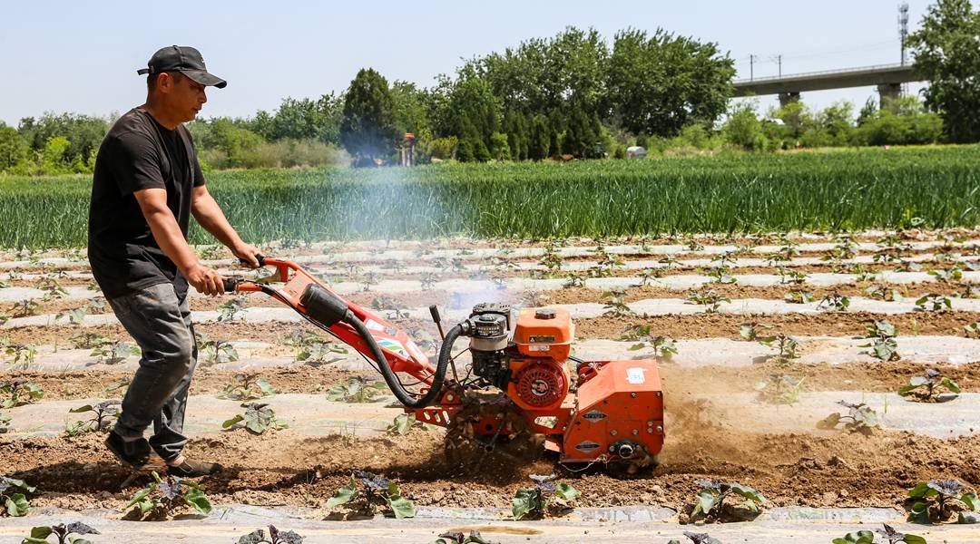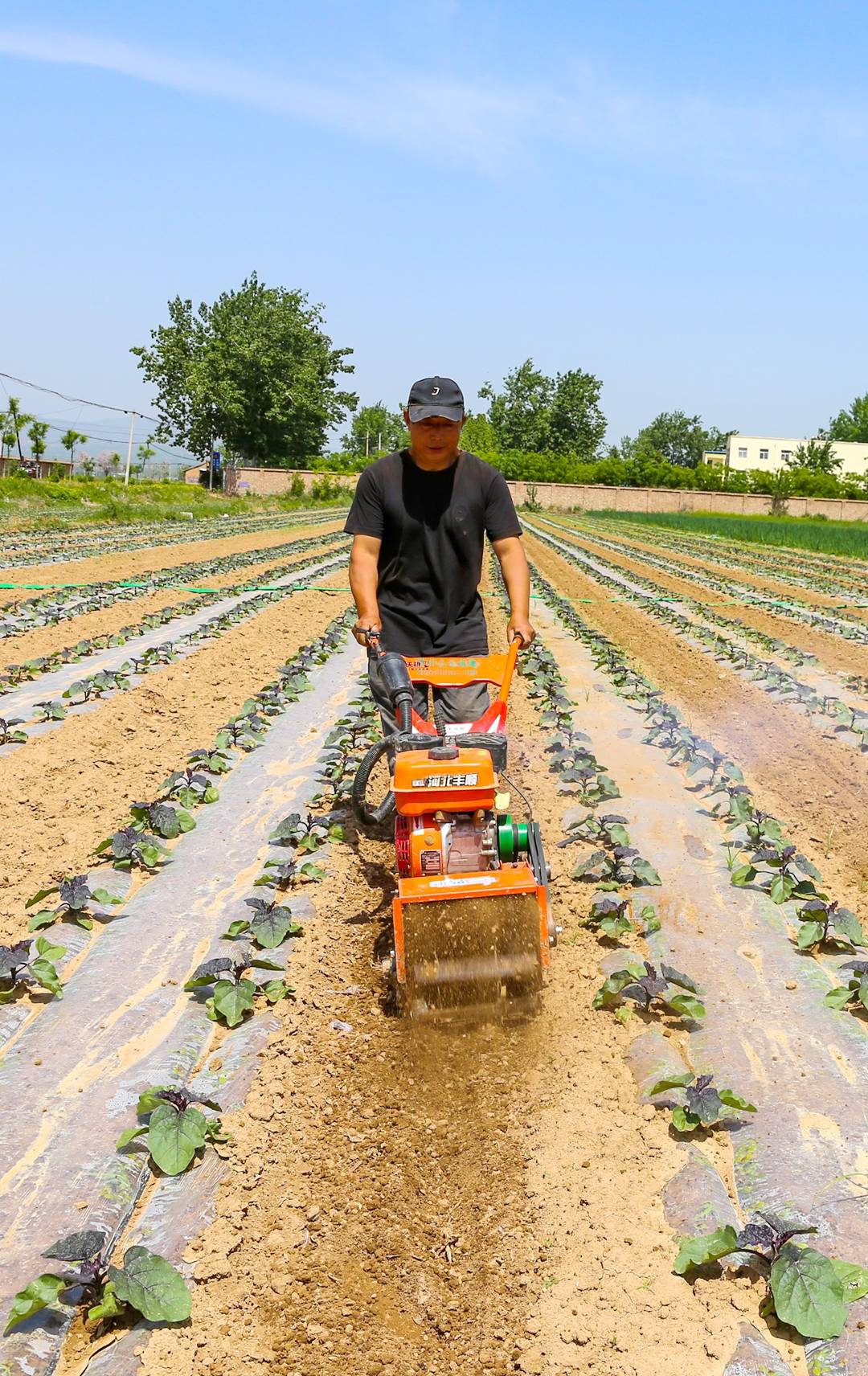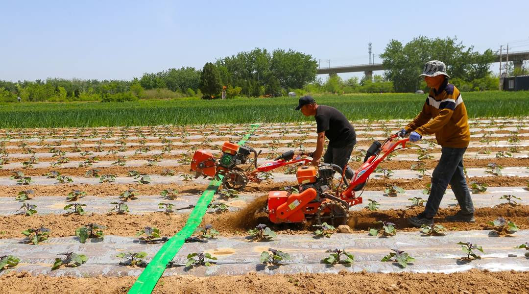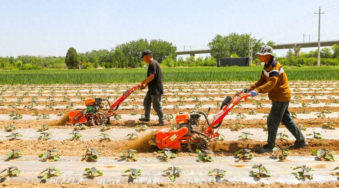 2026年4月25日,夏县水头镇一处家庭农场,员工操作微耕机正在覆盖的茄子行间进行旋耕松土、除草作业。